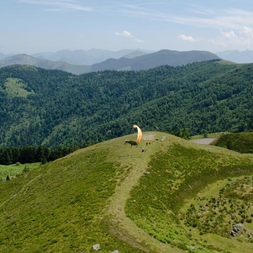 Une aérologie douce car assez protégée, une aire d’atterrissage vaste avec peu de vent de vallée du fait de sa configuration, un terrain de jeu important car ouvert à la plaine et à la montagne avec des départs vers le Béarn ou le Pays Basque. Bientôt, un bar / restaurant proche du décollage saura attirer les pilotes. Le projet de la station de ski de fond d’Issarbe, au futur proche, est de proposer un dortoir….